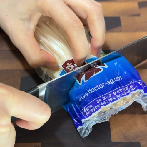 1. 팽이버섯 1봉(100g)의 밑둥을 잘라 버리고, 먹기 좋은 크기로 썬다.