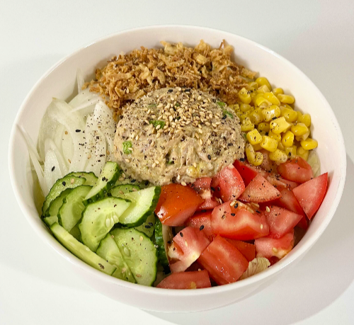 9. 준비해 둔 양파, 오이, 토마토 올리고, 스위트콘 2숟가락 넣는다.