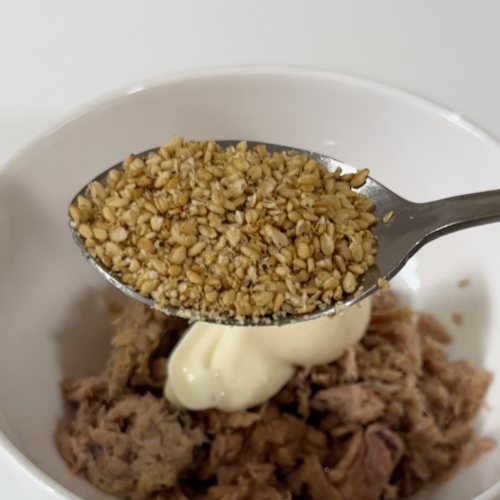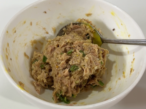 6. 참치와 소스를 잘 섞는다. (저는 머스터드를 선택했습니다)