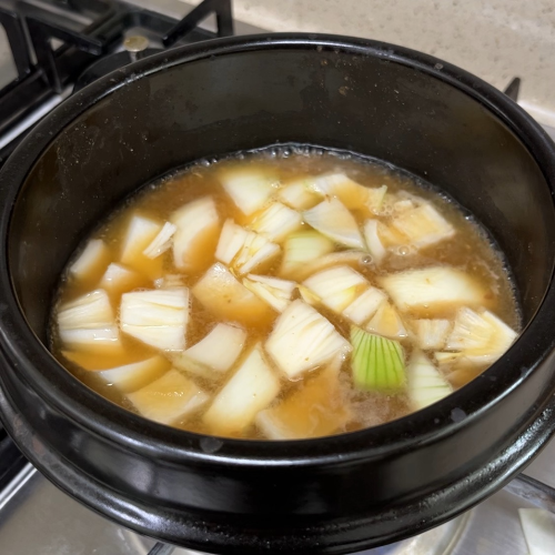 5. 썰어둔 양파를 넣고, 거품을 걷어내며 3분간 강불로 끓인다.(거품을 제거하면 국물이 더 깔끔해져요)