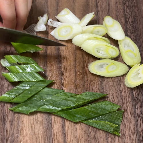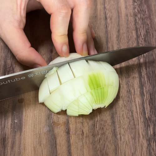 1. 양파 1/2개를 깍둑썰고, 대파 한대를 어슷 썬다.