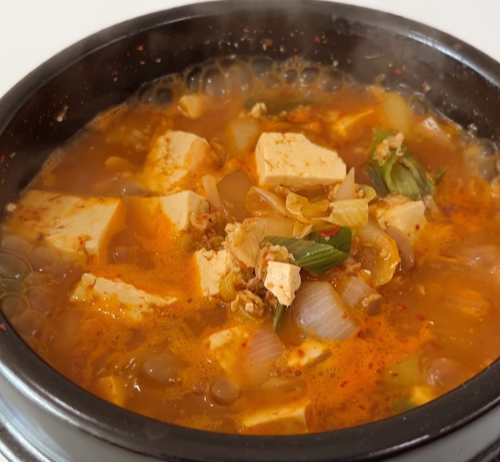 6. 두부, 대파, 고추를 녛고, 다진마늘과 고춧가루를 0.5 숟가락씩 넣는다.