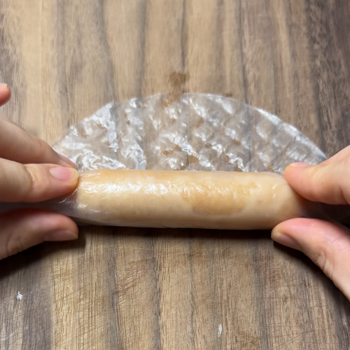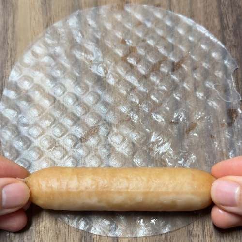 1. 물에 적신 라이스페이퍼 1장에 닭가슴살 소시지를 올려 돌돌 말아준다.